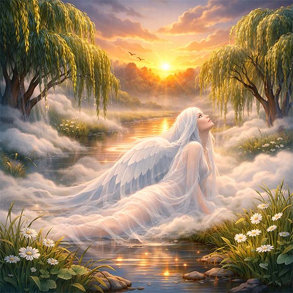 Торкнулася Хмаринка поверхні води, огорнула своїми білими, прохолодними обіймами сонні верби, розляглася м’якою ковдрою понад травами. Їй було так добре і спокійно, що вона забула про час. Вона цілувала кожну квітку, залишаючи на ній діамантові краплі роси, і шепотіла землі про свою любов.