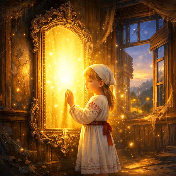 І тут сталося диво. Стара амальгама, що звикла відбивати людські гріхи, раптом затремтіла. З глибини скла, розганяючи вічний морок кімнати, полилося м’яке, золоте світло. Воно було таким яскравим, що пробилося крізь забиті віконниці й осяяло двір.