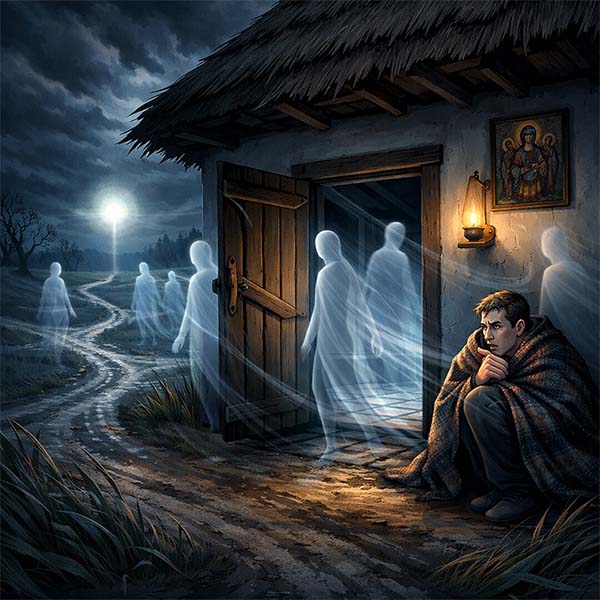 До самого ранку крізь хату йшли невидимі подорожні. Стукали віконниці, падав посуд, а піч диміла, відмовляючись тримати тепло. Остап, посивілий за одну ніч, сидів у кутку під образами, тремтячи як осиковий лист.