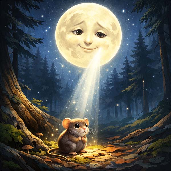 – Не плач, мала, – прошепотів Місяць. І знову хруснула небесна скоринка. Відламав він ще шматок, кинувши його вниз. Став він для мишки золотим зерном, якого вистачить на цілу зиму.