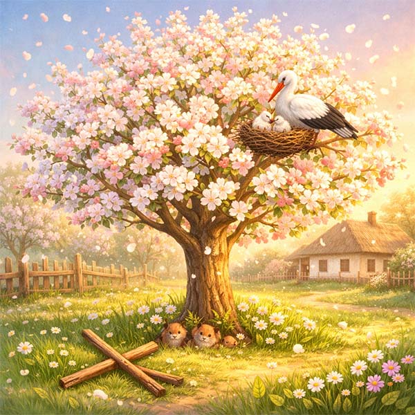 Вранці господар завмер на порозі. Там, де стирчав сухий хрест, стояло молоде, прекрасне дерево. Воно не мало листя, але кожна його гілочка, від низу до верхівки, була вкрита ніжним, біло-рожевим яблуневим цвітом. Воно пахло медом і вічністю.