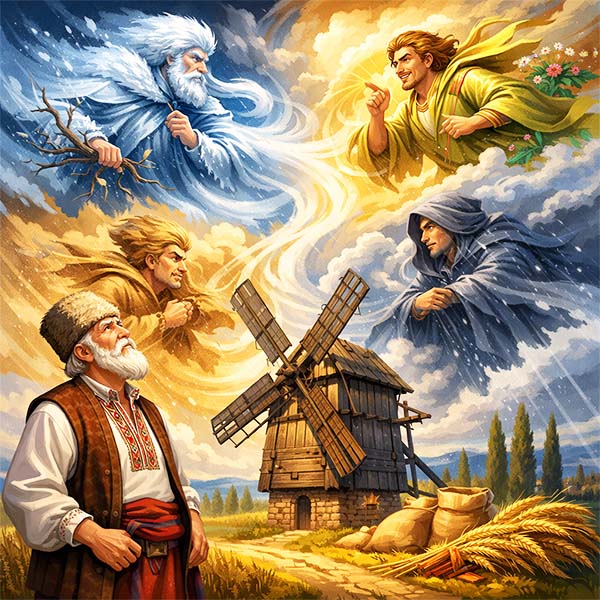 Було у мірошника чотири частих гості, чотири брати-вітри. Першим прилітав Сівер – північний вітер, суворий, крижаний, вдягнений у плащ із інею. Він гудів басом, ламаючи сухе гілля. Другим з’являвся Легіт – південний вітер, лагідний та грайливий, що пахнув степовим чебрецем і теплом. Третім був Стриг – східний вітер, сухий і рвучкий, що ніс куряву далеких пустель. А четвертим прилинав Мокрій – західний вітер, вологий, плаксивий, що завжди волочив за собою важкі сизі хмари.