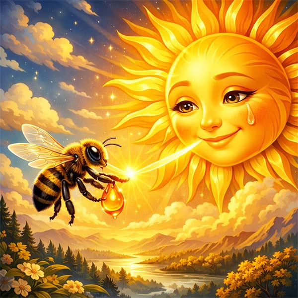 Він жовтий, бо в ньому живе світло Сонця. Він солодкий, бо це сама любов небес. І він цілющий, бо той, хто його куштує, наповнюється силою вічного вогню. А бджоли й досі гудуть, розповідаючи квітам про свою велику подорож до світила.