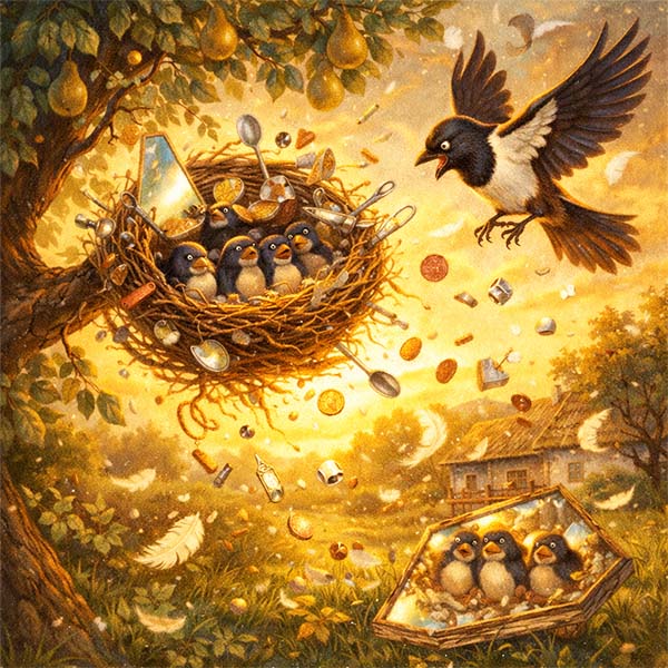 Впало гніздо, розсипалися монети, розбилося дзеркало. Сорока в розпачі літала навколо, збираючи своїх переляканих пташенят у траві. Вона дивилася на купу сміття, яке ще хвилину тому вважала скарбом, і гірко плакала.