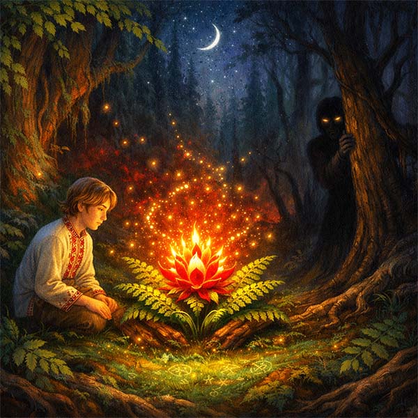 У прадавні часи, коли ліси були храмами, а дерева – братами, папороть не ховала своєї вроди. Вона цвіла цілий рік, і квіти її горіли, наче маленькі сонця. Вночі ліс не спав у темряві – він сяяв м’яким, червоним світлом, і кожен подорожній міг знайти дорогу додому.
