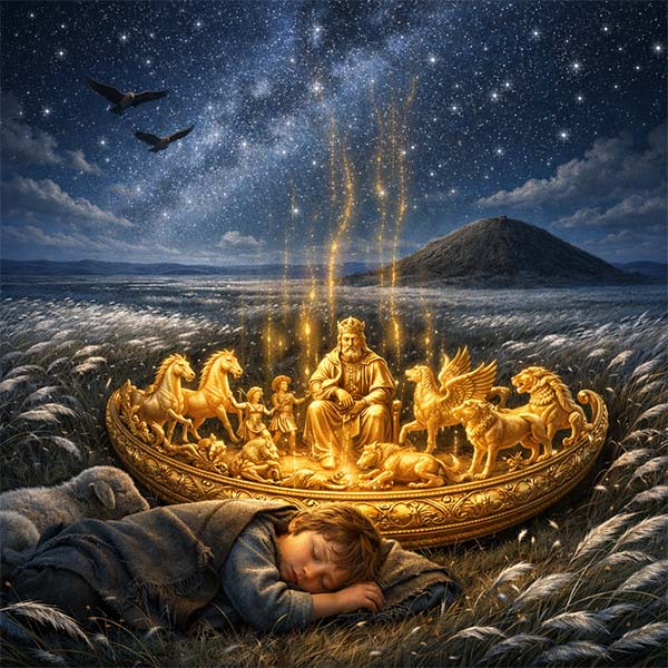 Спершу пастушок почув тихий дзвін, ніби тисячі дрібних струн заграли водночас. Він розплющив очі й побачив диво: фігурки на пекторалі заворушилися. Маленькі золоті коні заіржали, струшуючи гривами зоряний пил, а грифони розправили крила.